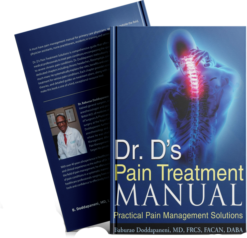 Baburao Doddapaneni.MD, known as Dr. D, is a renowned pain management specialist with 40+ years of experience in healthcare. Educated in India, he trained in general surgery in Britain and Scotland, earning his M.D. from the Royal College of Surgeons & Physicians in London and completing surgical training in Edinburgh. He later specialized in anesthesiology and pain management at Boston University Hospital, where he became Director of Pain Management. After serving in the same role at Cornell University Methodist Hospital, he established his private practice. A pioneer in pain management, Dr. D shares his expertise in Dr. D’s Pain Treatment Manual, providing practical, systematic strategies that empower healthcare professionals to confidently treat pain conditions.